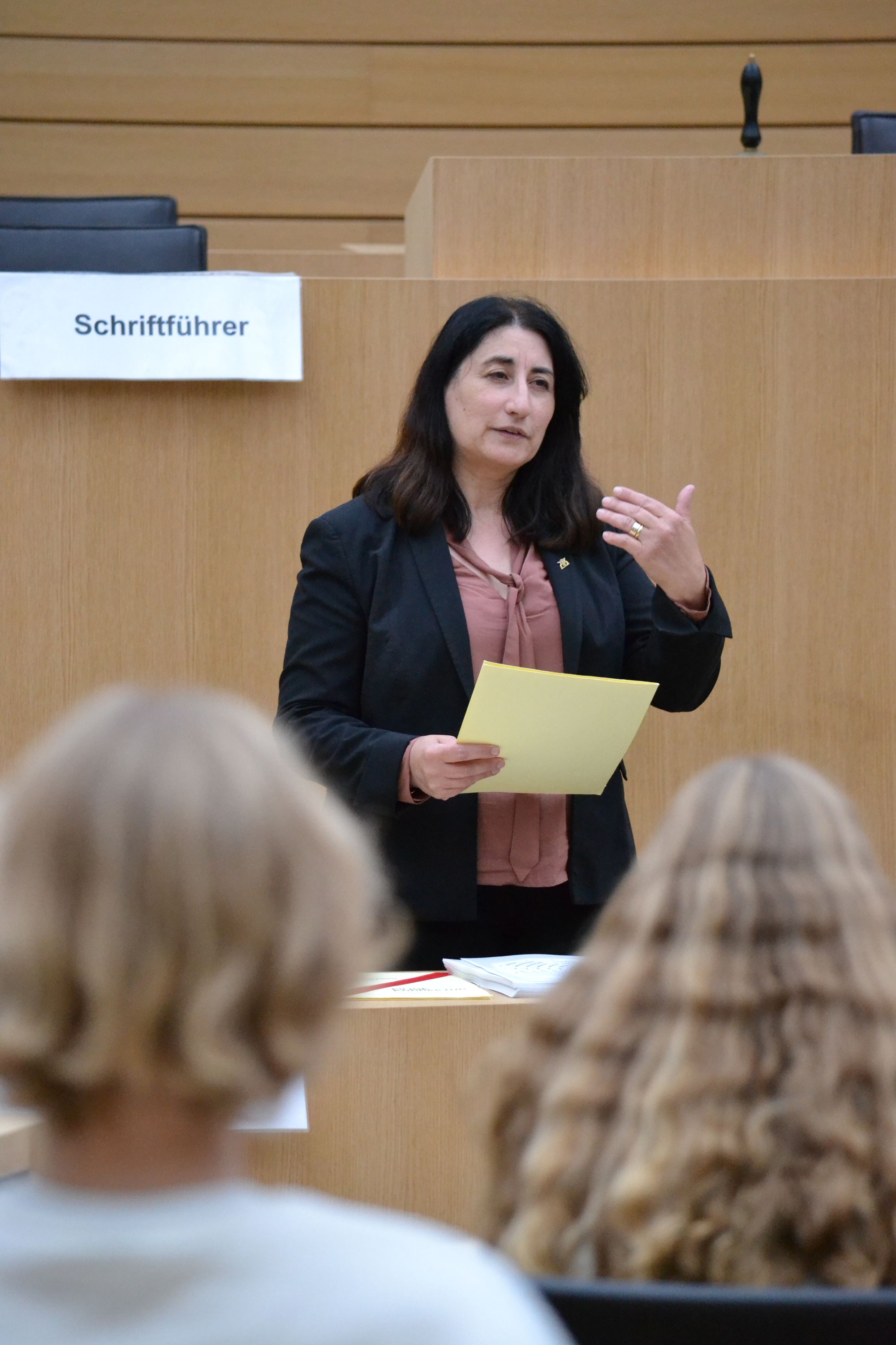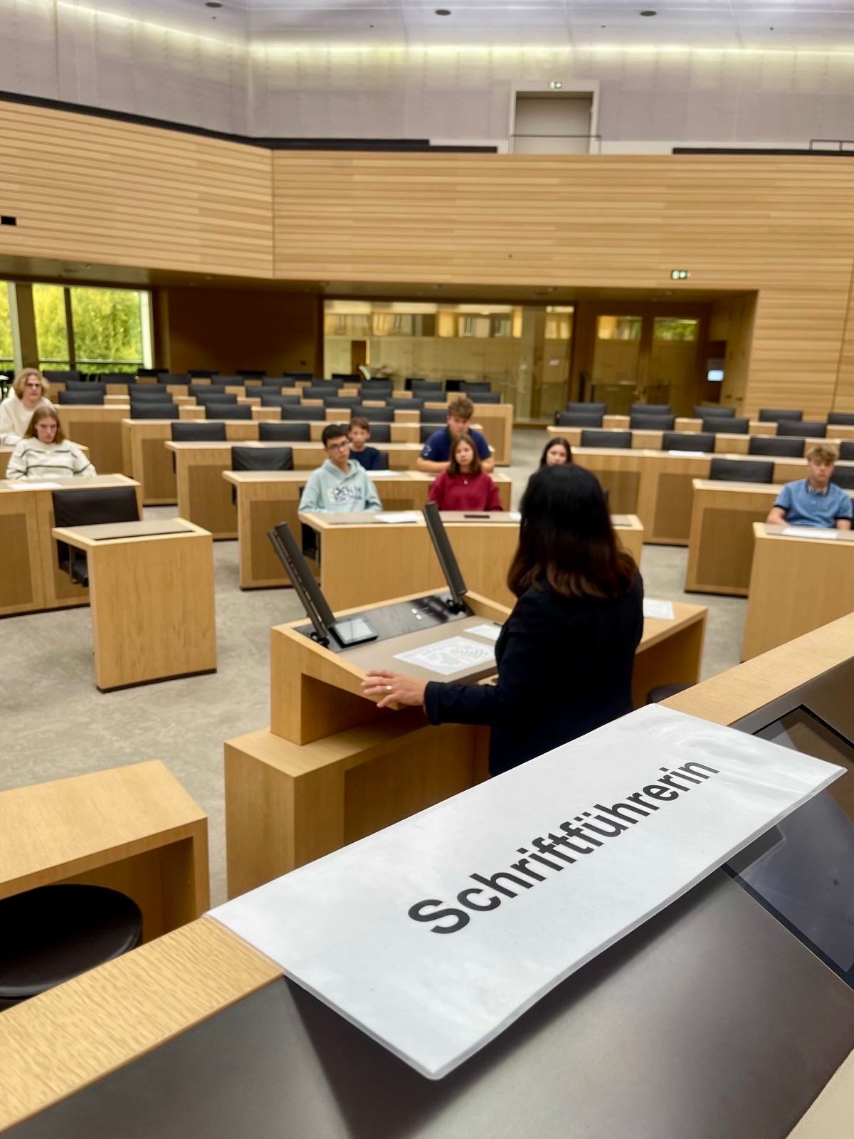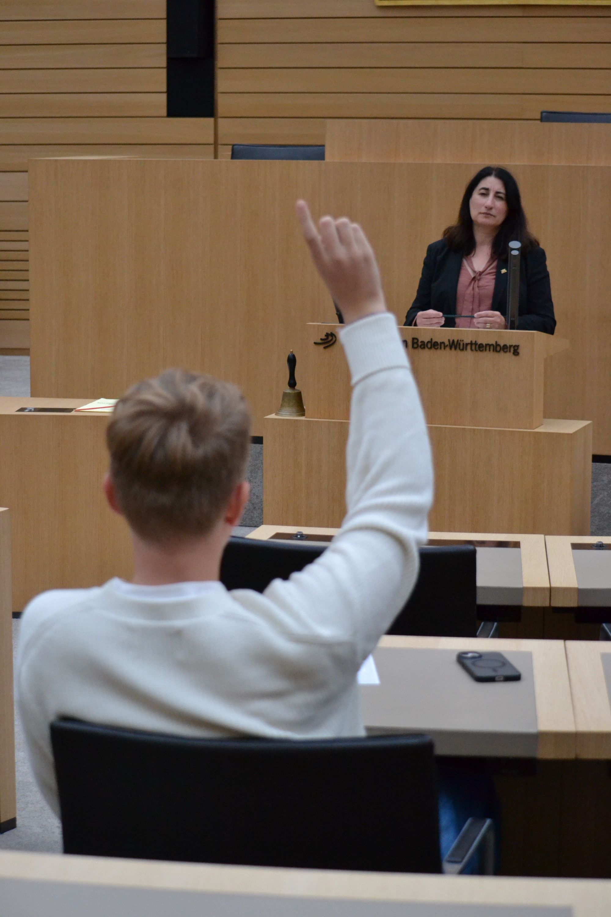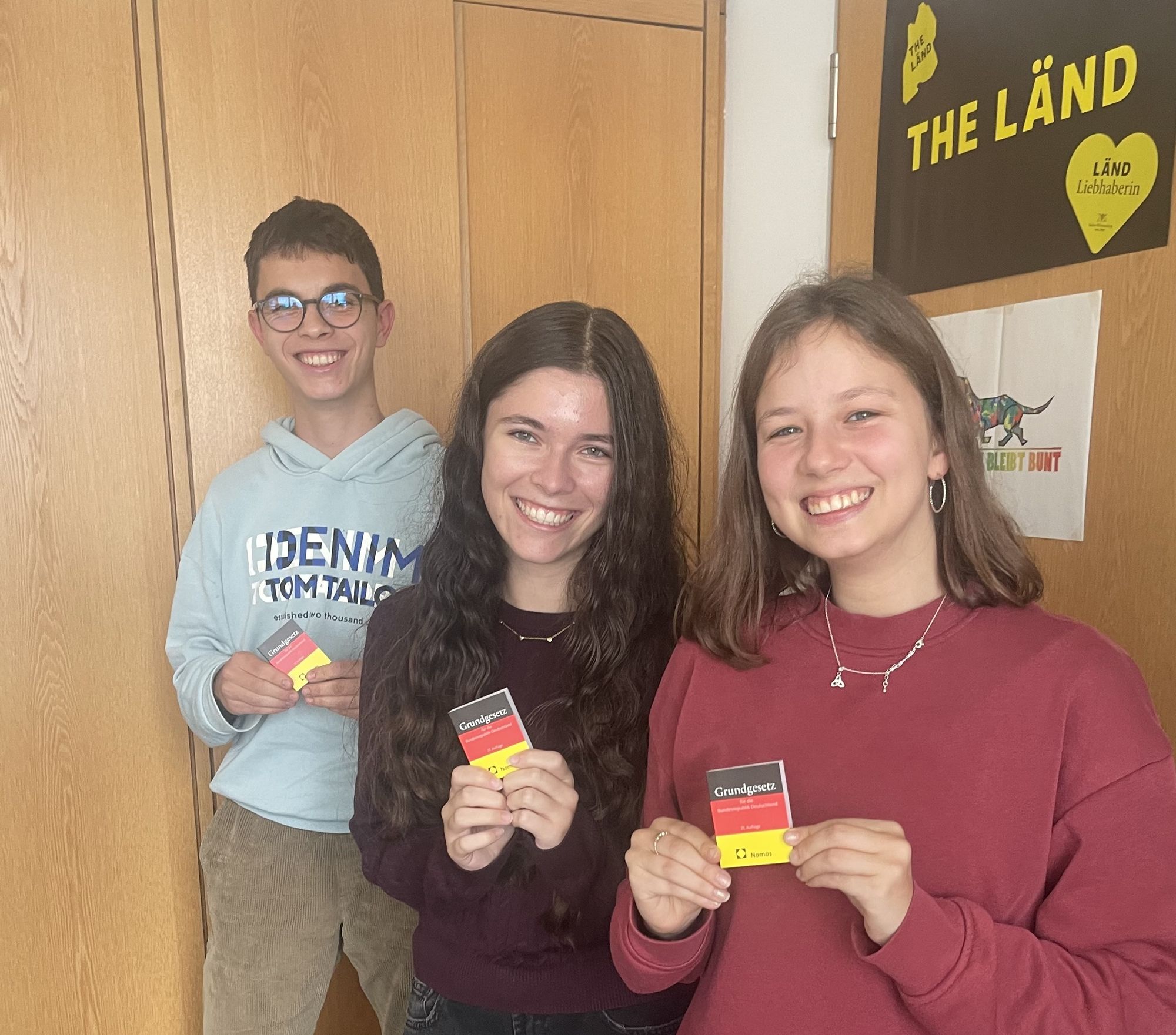 Im Plenarsaal - auf den Sitzplätzen der Landtagsabgeordneten. Fotos: Team TuncerAustausch mit CDU-Innenminister Thomas Strobl, Sozialminister Manne Lucha und dem jugendpolitischen Sprecher von BÜNDNIS 90/DIE GRÜNEN, Erwin Köhler. Fotos: Team Tuncer Bei Burger und Bowls haben sich die Jugendvertreter:innen kommunenübergreifend über Kommunalpolitisches ausgetauscht und vernetzt. Im angrenzenden Haus der Geschichte gab’s noch eine Führung durch die Ausstellung „Freischwimmen“. Sie zeigt anhand von Badekultur und Bademoden auch, wie lange es mit der Emanzipation der Frauen im 20. Jahrhundert gedauert hat. Und in meinem Büro gab’s schließlich noch ein Mini-Grundgesetz für die Hosentasche!