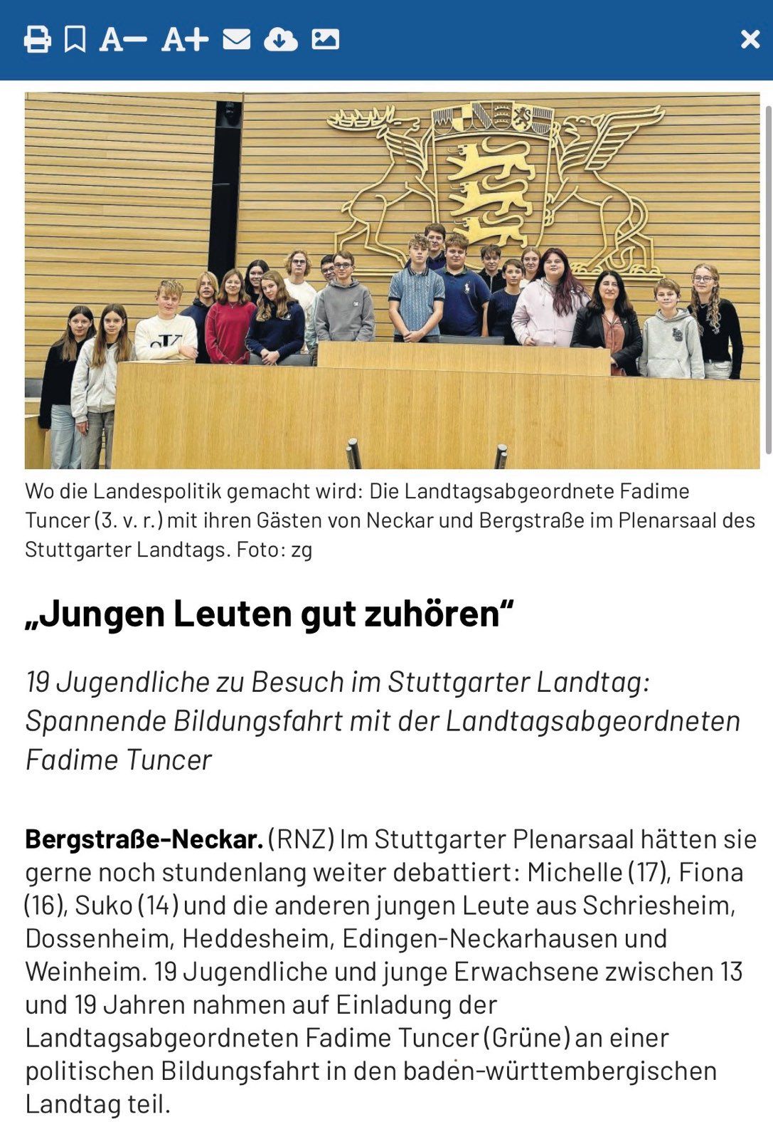 Die Rhein-Neckar-Zeitung berichtete am 6. November 2025 in ihrer Print-Ausgabe über den Besuch der Jugendlichen im Stuttgarter Landtag.
