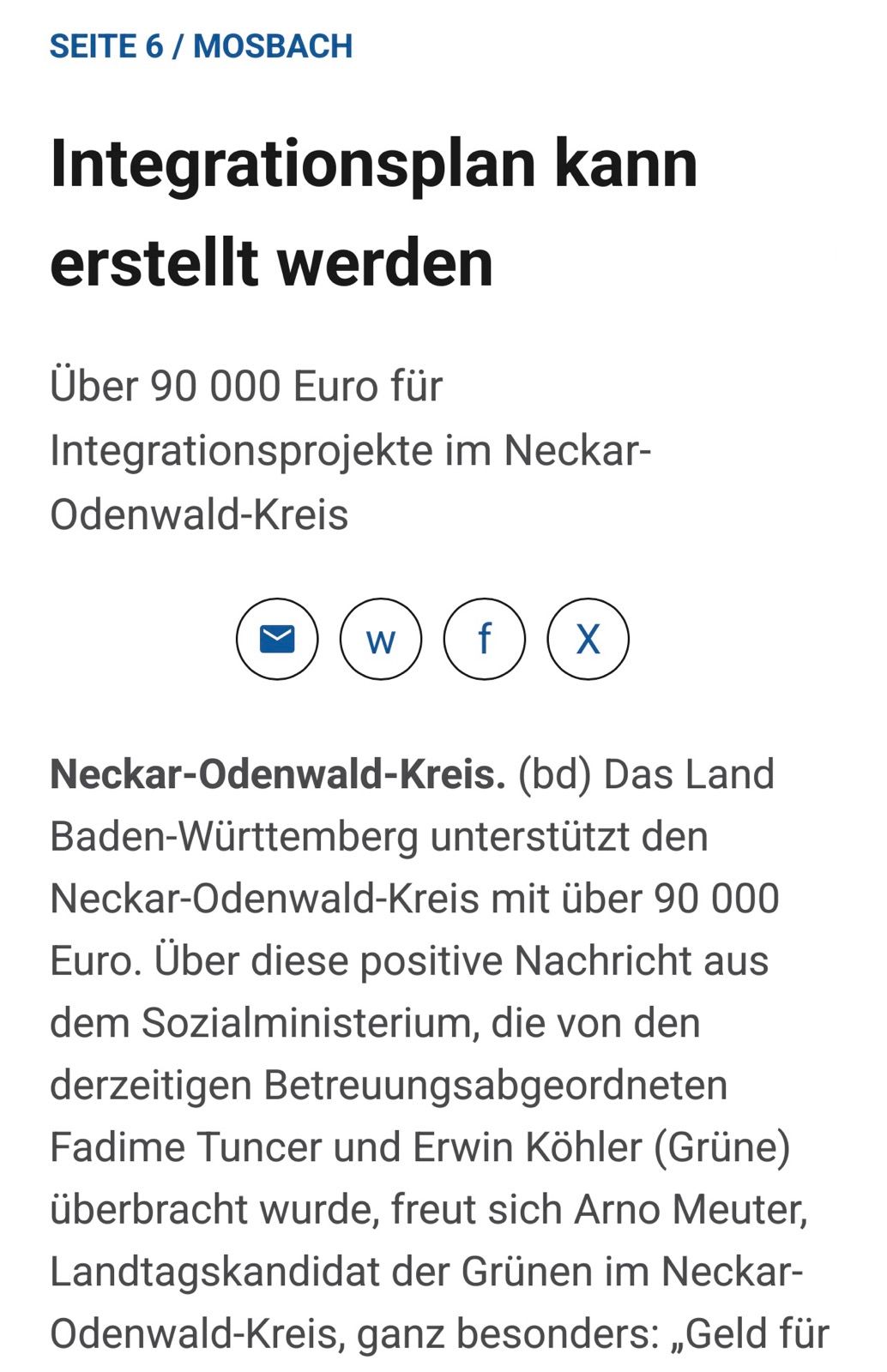 Stuttgart / Buchen. - Die Landtagsabgeordneten Fadime Tuncer und Erwin Köhler (Grüne) freuen sich über insgesamt 90.000 Euro Zuschuss des Landes für Integrationsplanung und -maßnahmen im Neckar-Odenwald-Kreis. „Ländliche Regionen haben ein großes Potenzial, wenn es darum geht, Integration gut gelingen zu lassen. Mit unserer Unterstützung möchten wir dazu beitragen, Chancen zu nutzen, Hürden abzubauen und das Zusammenleben auf dem Land noch stärker zu machen. Dafür steht sinnbildlich der Integrationsplan des Landkreises Neckar-Odenwald.“